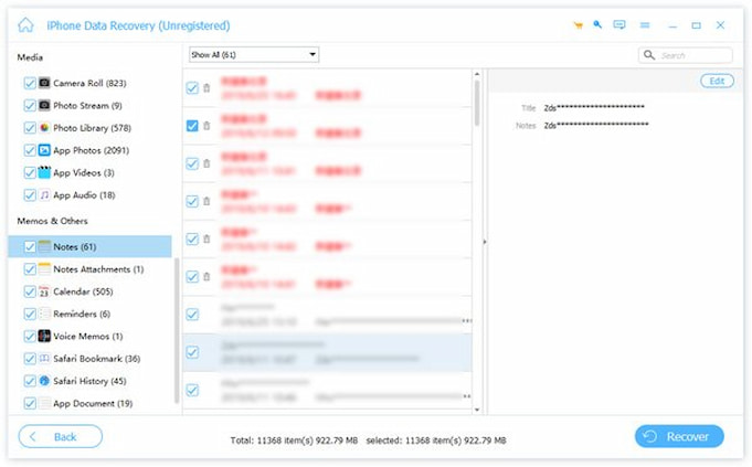 Step 3. Preview and select the notes you desire to recover. Click Recover to restore the selected notes to your iPhone.