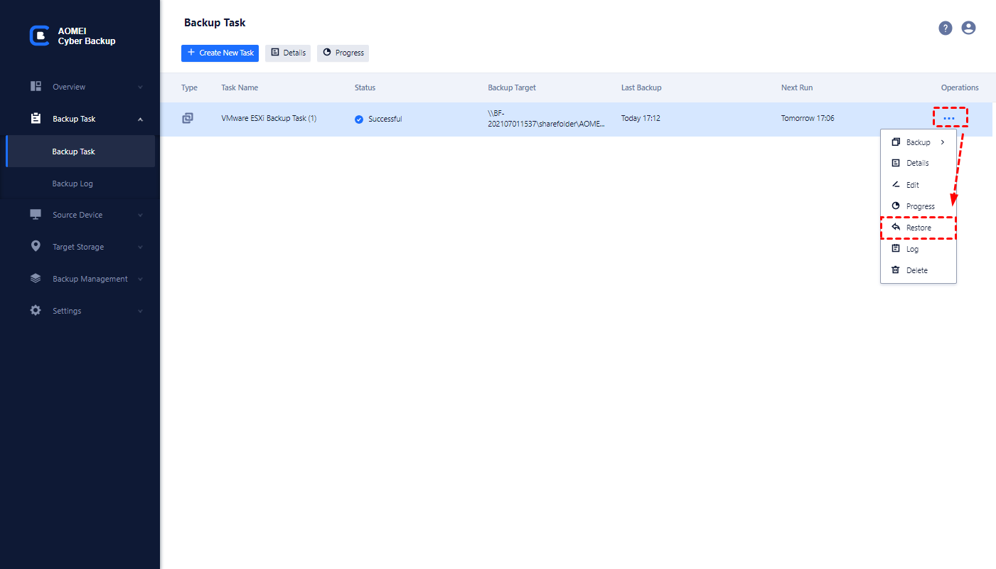 Step 6. Find the backup task you want to restore from the created backup tasks and click … > Restore. Select Restore to the original location to create the same data directly from the backup.
