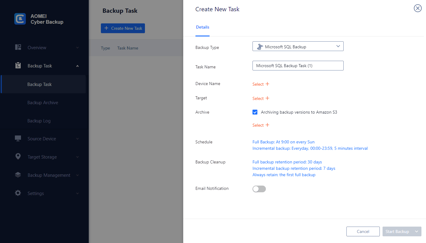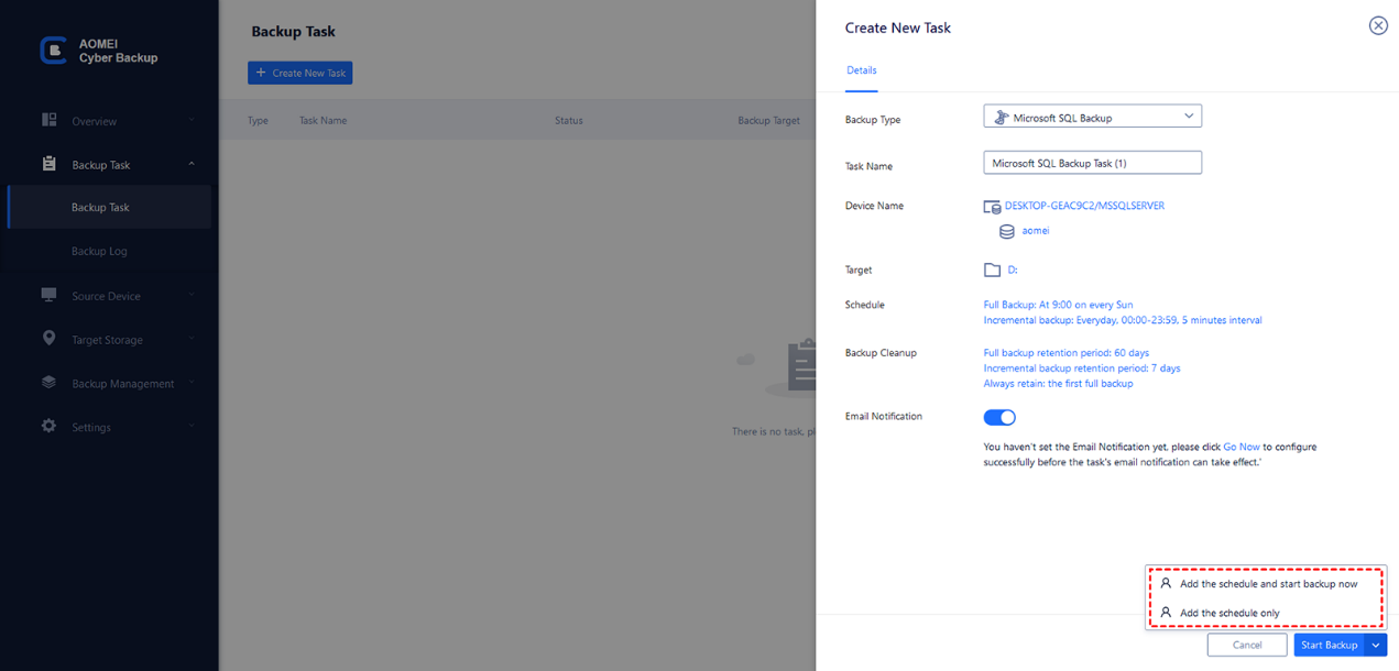 Comprehensive backup options: Whether you’re managing a small database or a complex SQL Server setup, AOMEI Cyber Backup supports full backup to protect all SQL database objects. And support incremental backup to only backup changed or newly added SQL data.