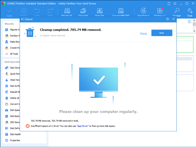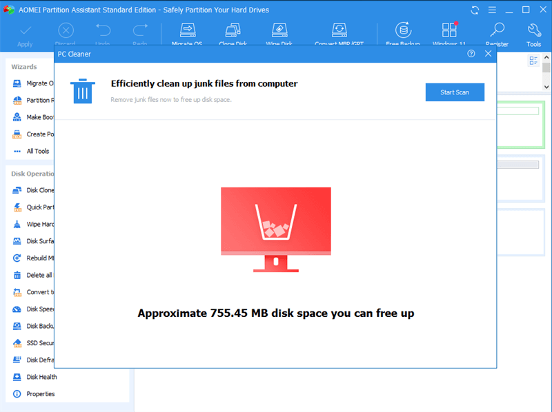 Tip: AOMEI Partition Assistant Standard Edition makes it all effortless. With its powerful “PC Cleaner” feature, you can scan your device to find all the junk files and unnecessary data blocking your system. Besides, it has many other embedded features waiting for you to try.