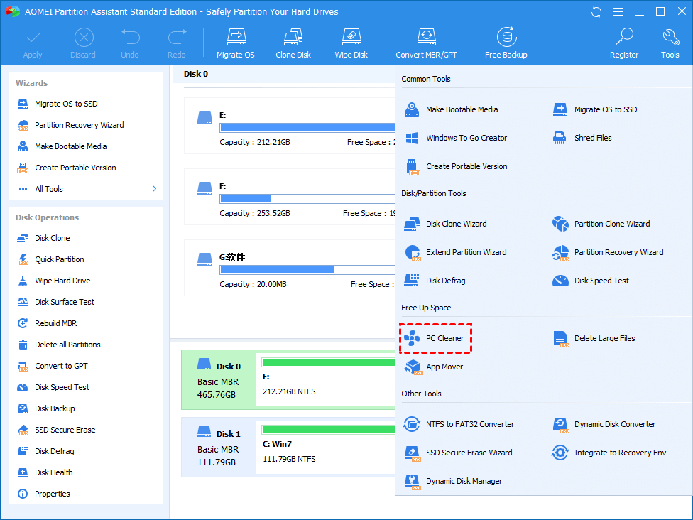 Step 1. On the main interface of AOMEI Partition Assistant Standard, click “Tools” and “PC Cleaner”.
