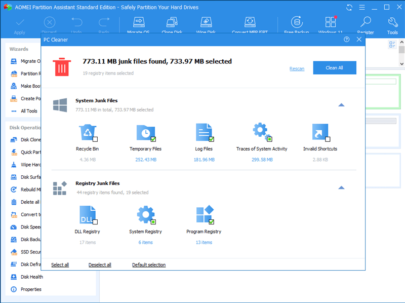 The PC Cleaner function in AOMEI Partition Assistant Standard can scan your computer for various types of junk files, such as system junk files and registry junk files. Once the scan is complete, you can view the results and select the files you want to delete. The program also allows you to undo any changes made during the cleaning process, in case you accidentally delete something important. And it’s very easy to use, you can finish the cleanup with a few clicks.
